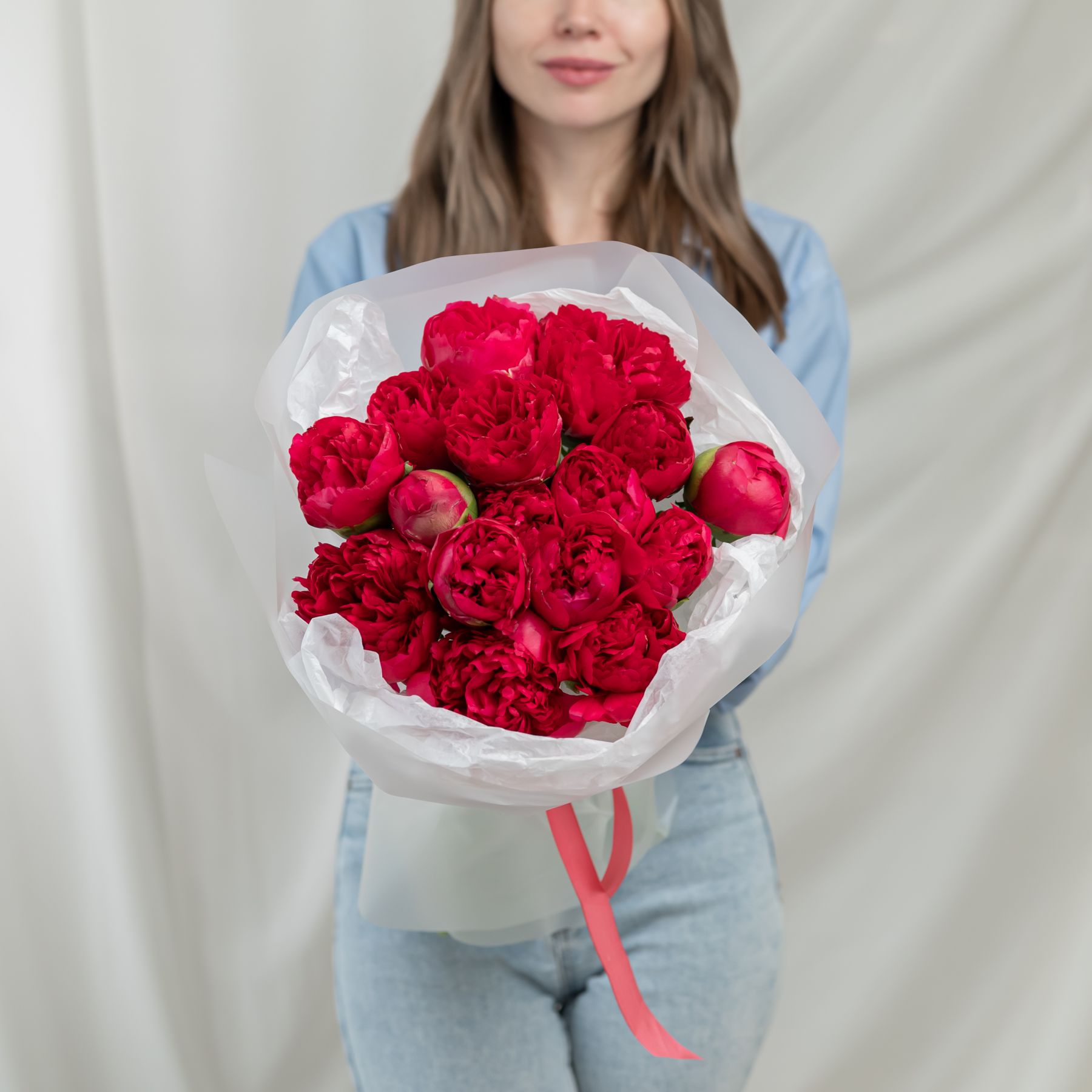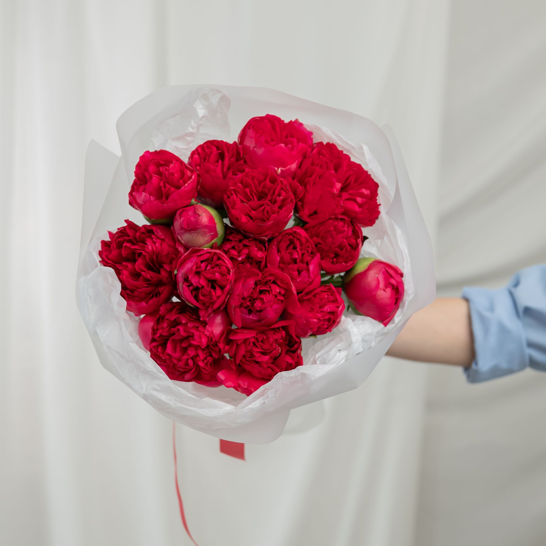 В составе 15 красных пионов в дизайнерской упаковке.