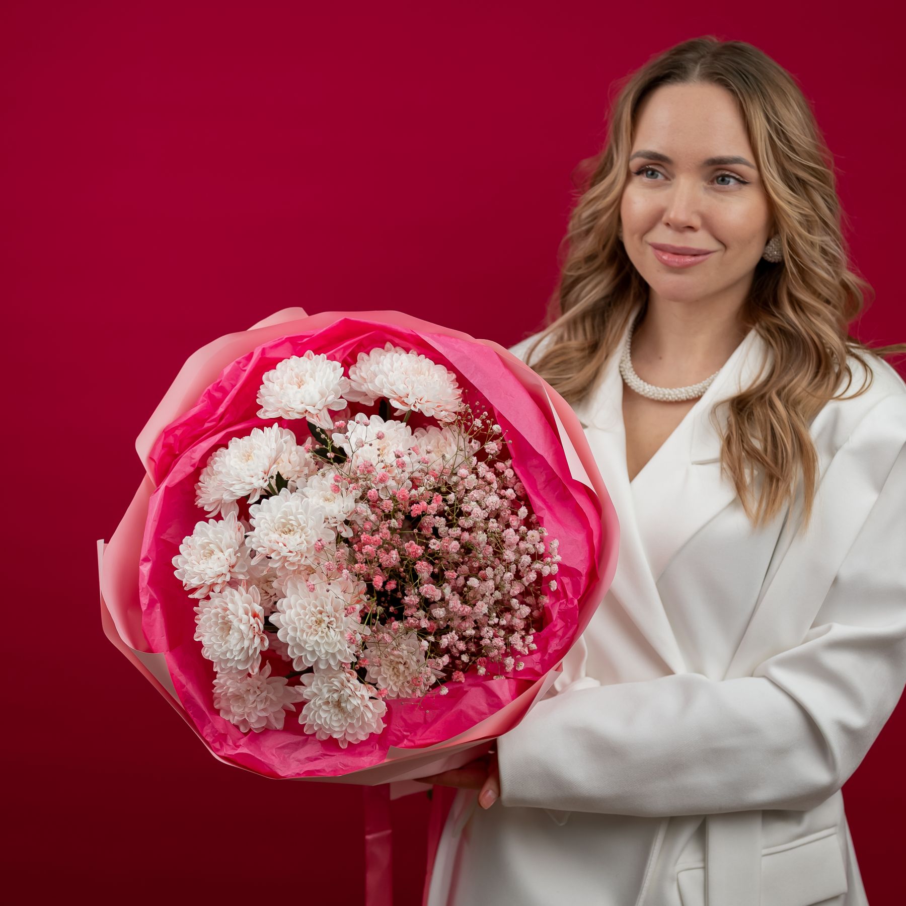 Букет из хризантемы "Алтай" и розовой гипсофилы