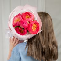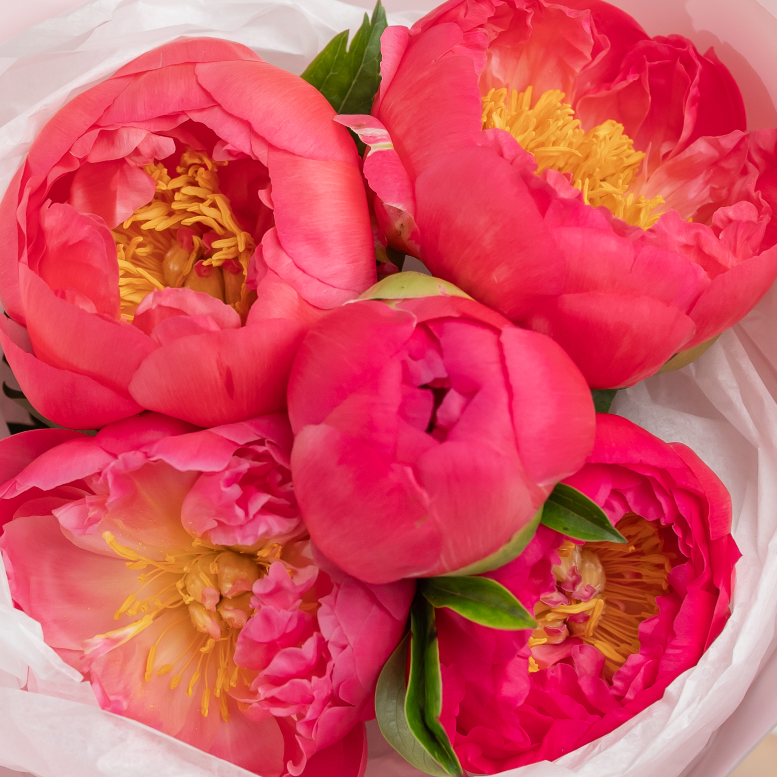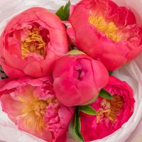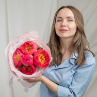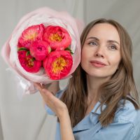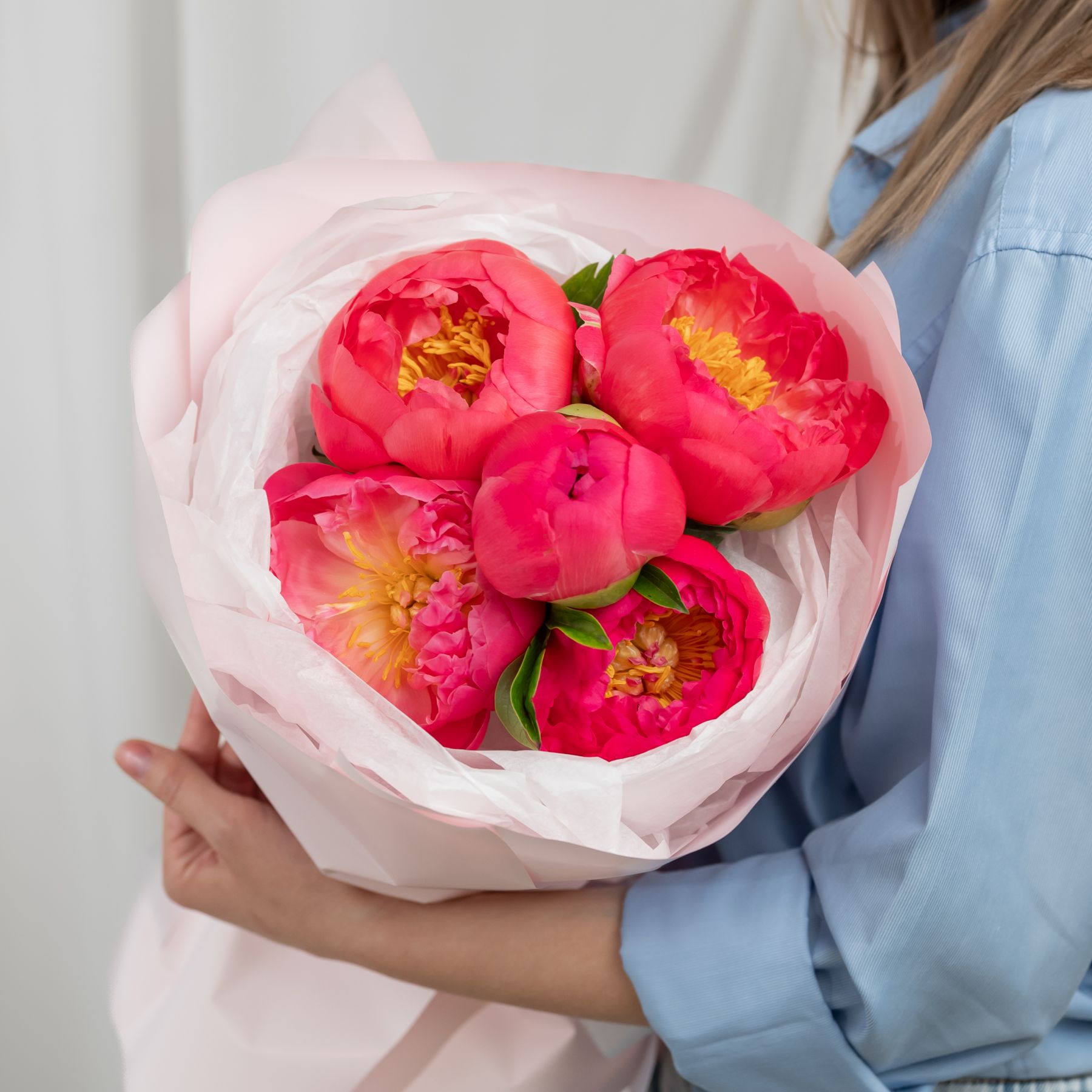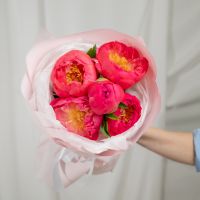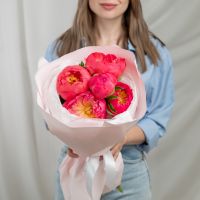 В составе 5 пионов (Корал Шарм) в объемной стильной упаковке.
