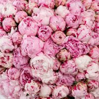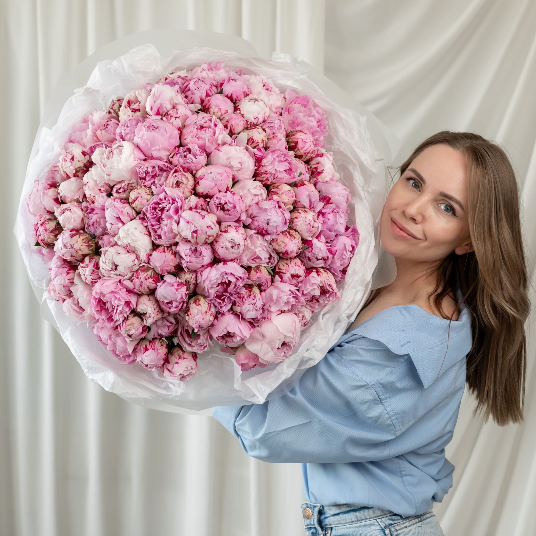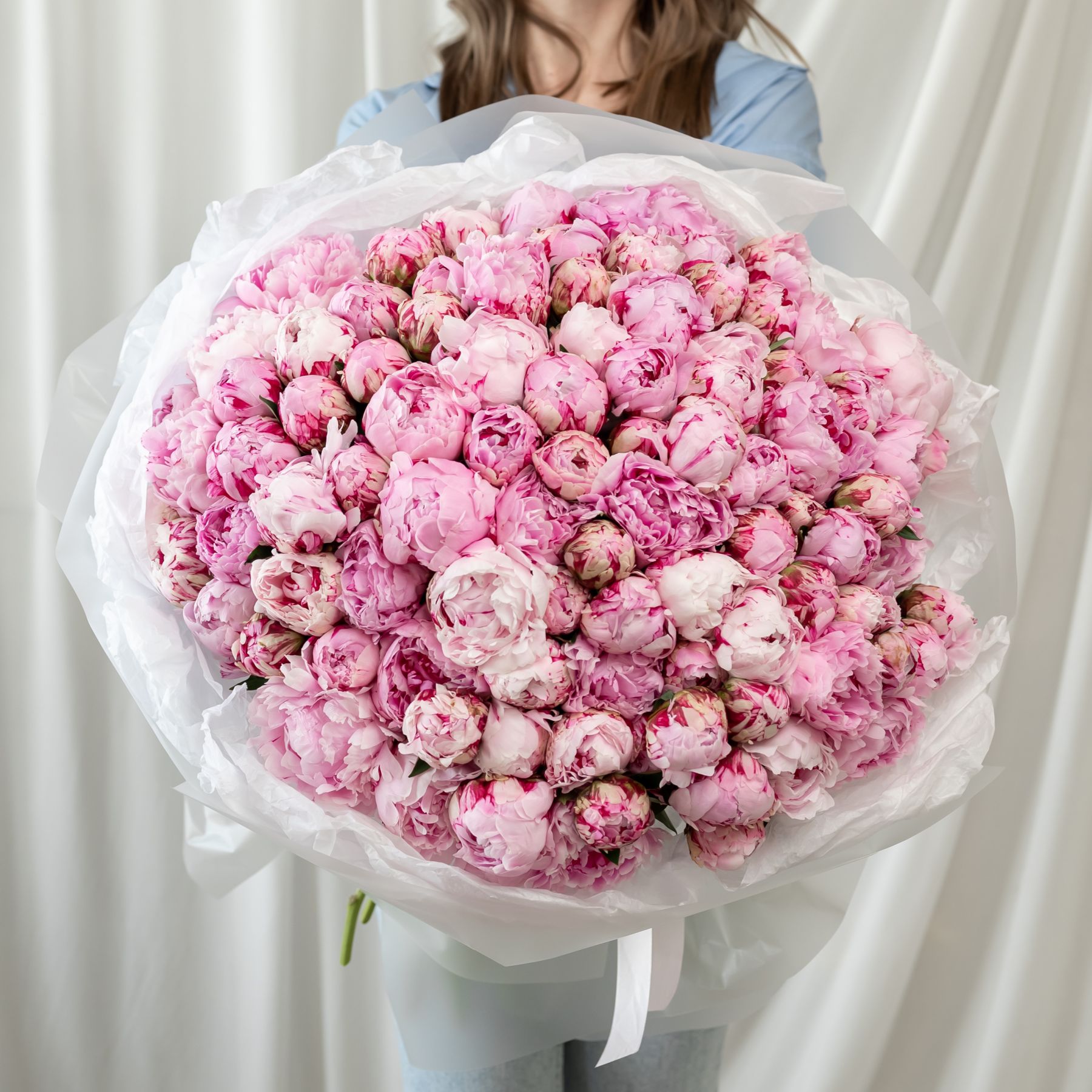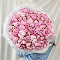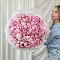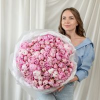 В составе 101 пион (сорт Сара Бернард) в дизайнерской упаковке.