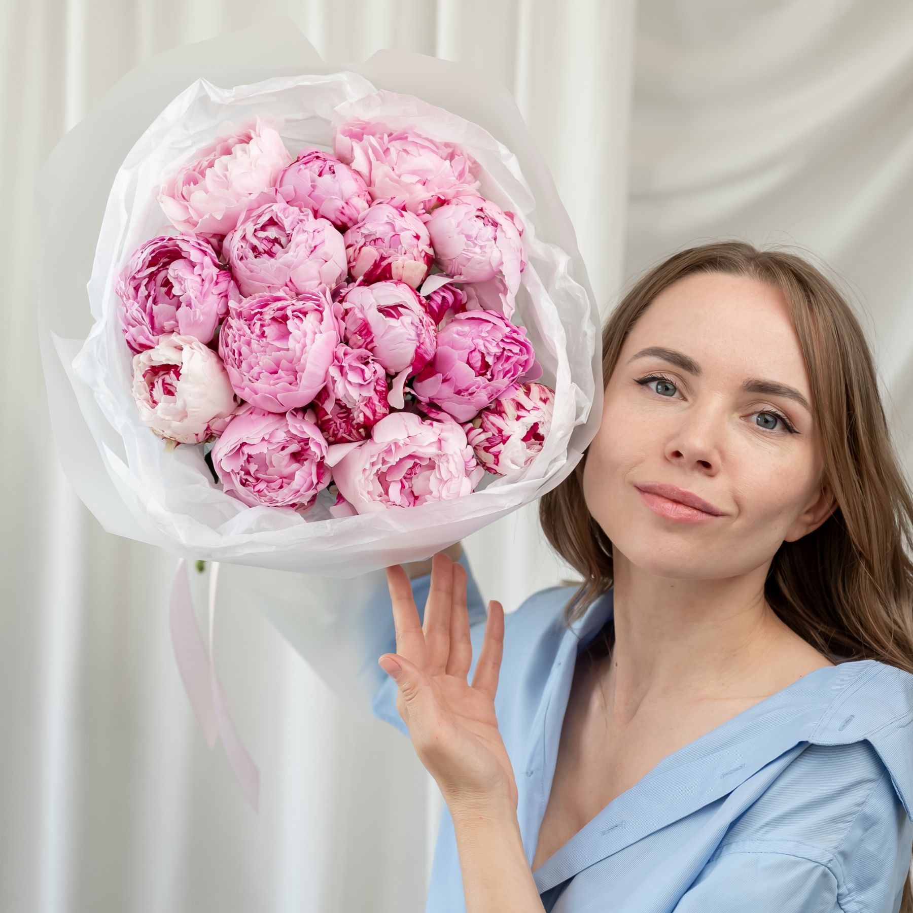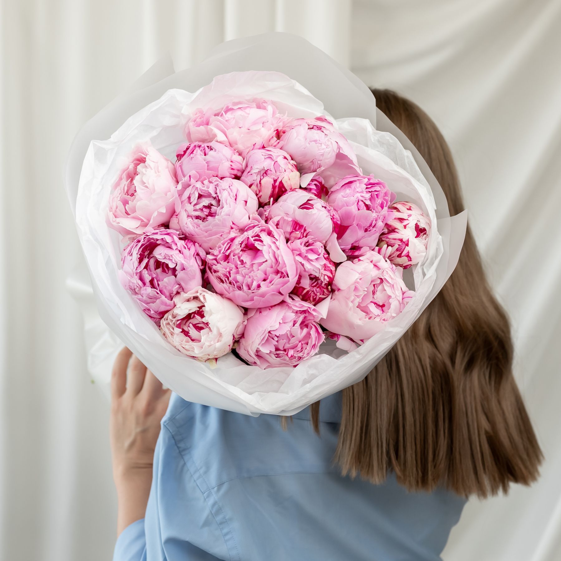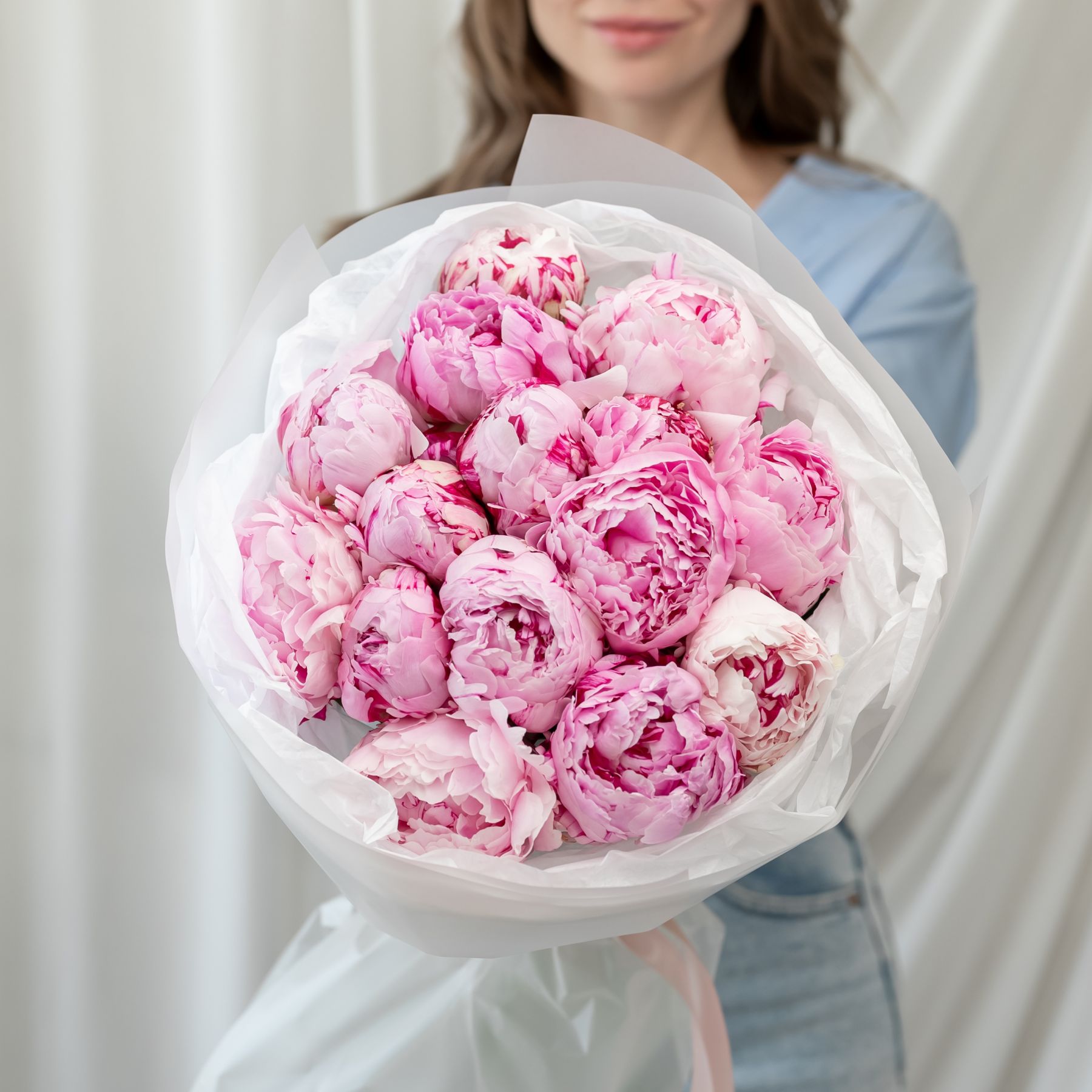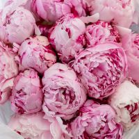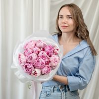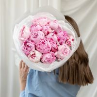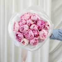 В составе 15 пионов (сорт Сара Бернард) в дизайнерской упаковке.