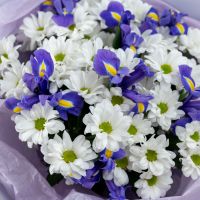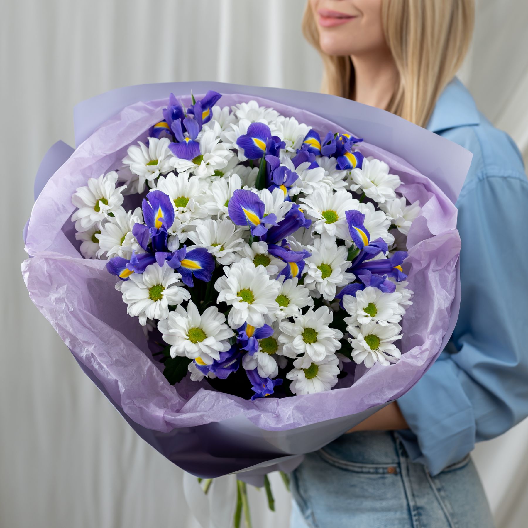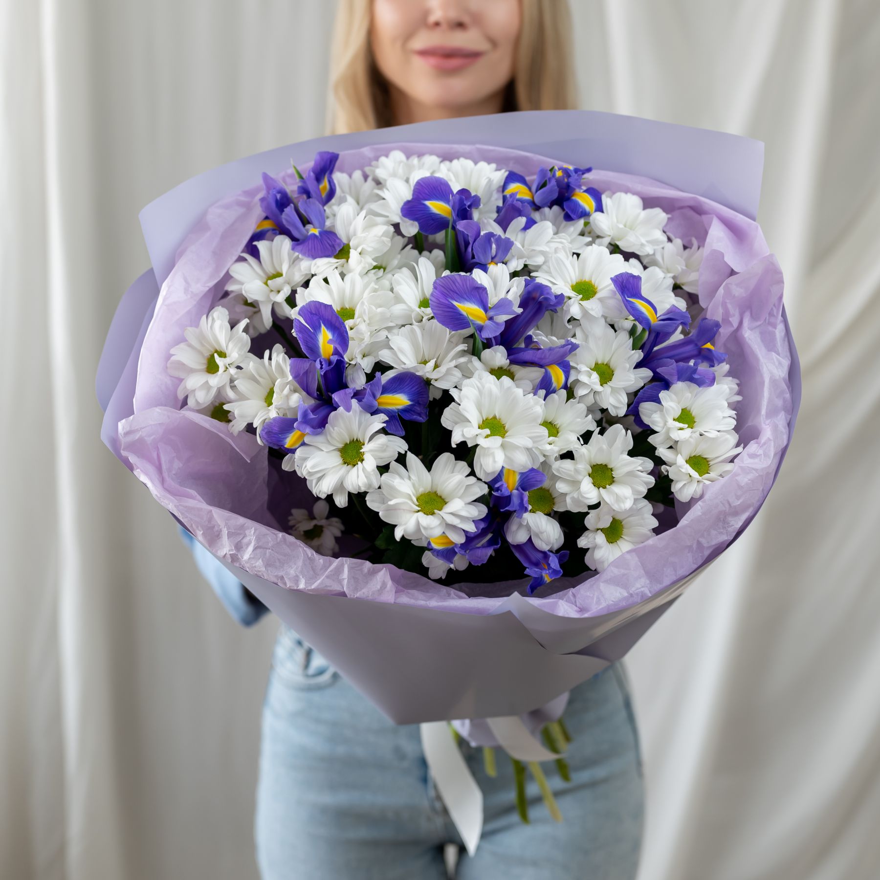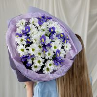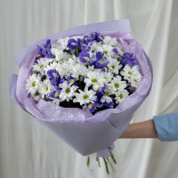 В составе хризантема кустовая (сорт Алтай) 6 шт, ирис 7 шт, упаковка дизайнерская.